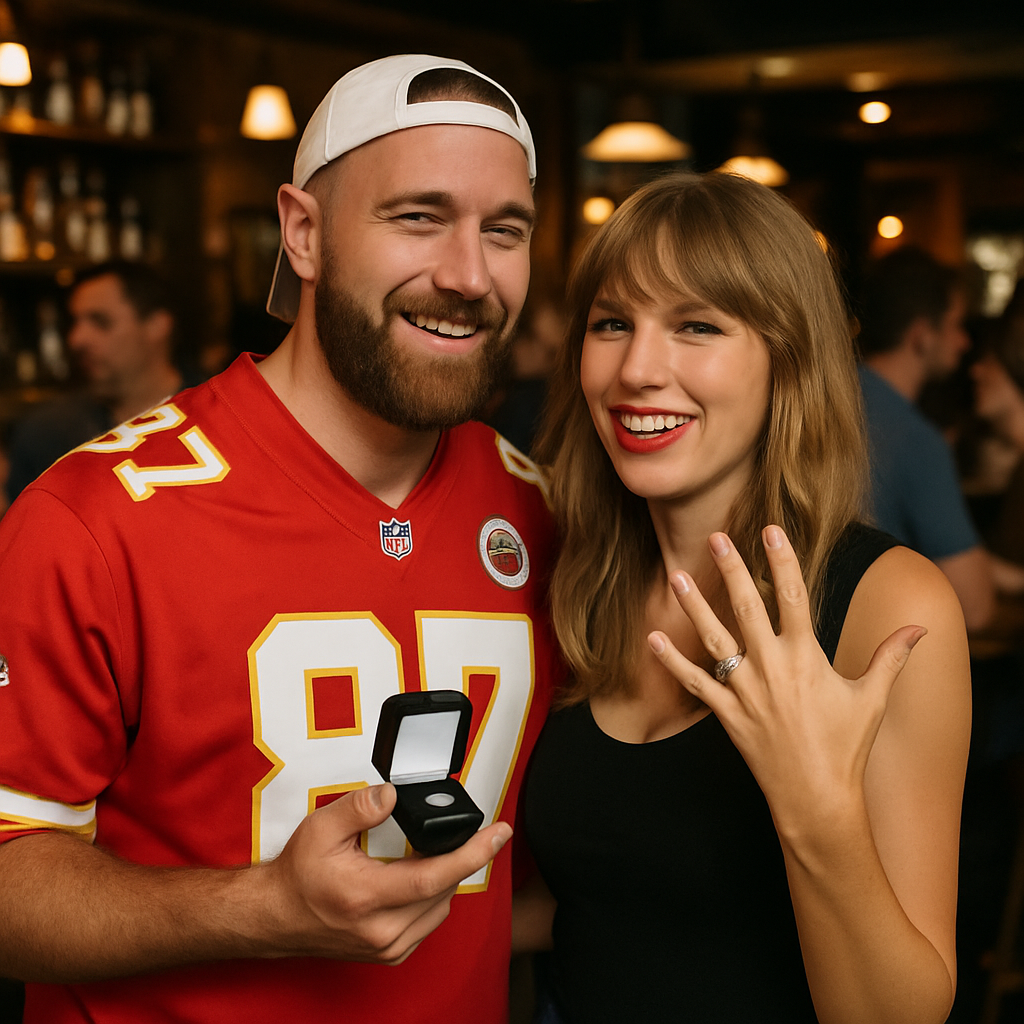 DIY Tip: Chiefs vibe on a budget: red tee with taped “87,” white athletic pants, eye black. For Taylor, a rhinestone bra over nude fishnets plus a feather fan. Fake ring from a jumbo craft gem; mic = painted toy or hairbrush.